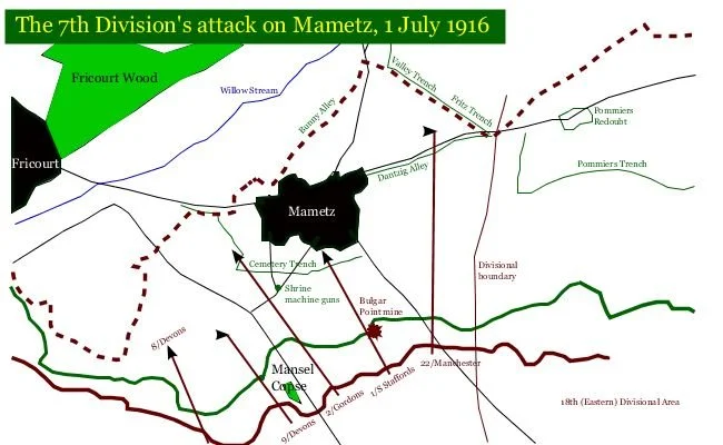 Map showing the direction of the Gordon Highlanders advance during the attack near Mametz
