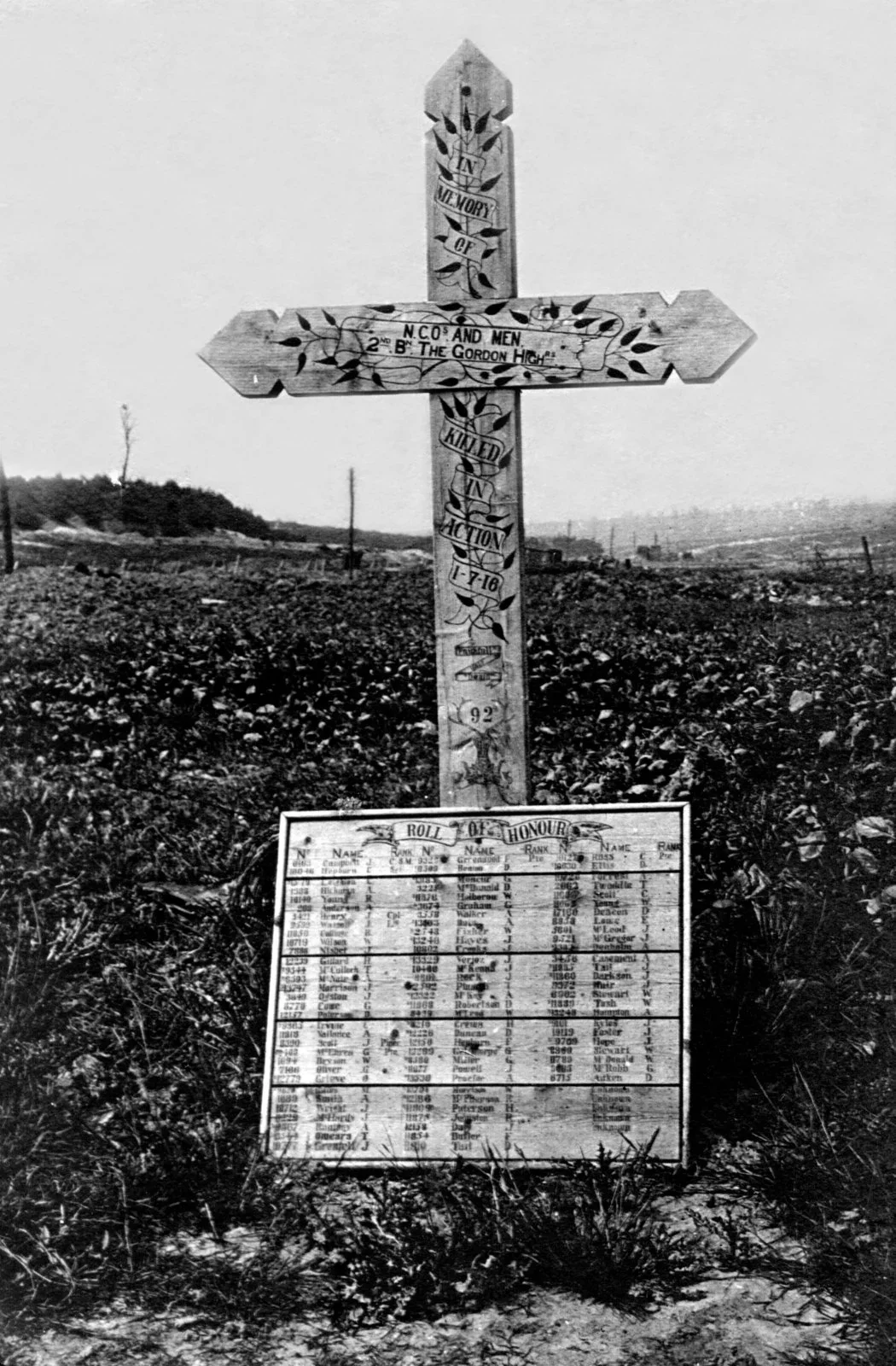 Photo of the wooden Memorial cross erected shortly after the battle. It lists the 2nd Gordons who died on July 1 1916.